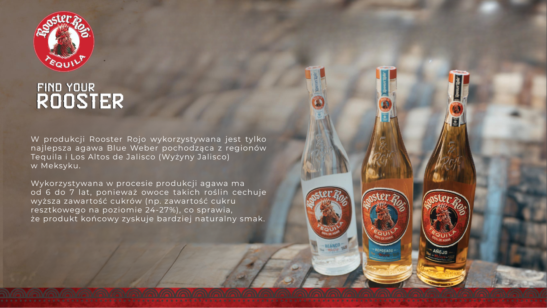 Przedstawiamy ekscytującą nowość na dynamicznie rozwijającym się rynku premium tequili – produkt tworzony w samym sercu Jalisco, kolebce tequili, u podnóża wulkanu Tequila. Wyprodukowana w 100% z niebieskiej agawy Weber, Rooster Rojo to połączenie najlepszych tradycyjnych metod wytwarzania tequili z ogromną pasją, dążeniem do perfekcji i 45-letnim doświadczeniem naszego mistrza destylacji – Arturo Fuentes Cortésa.